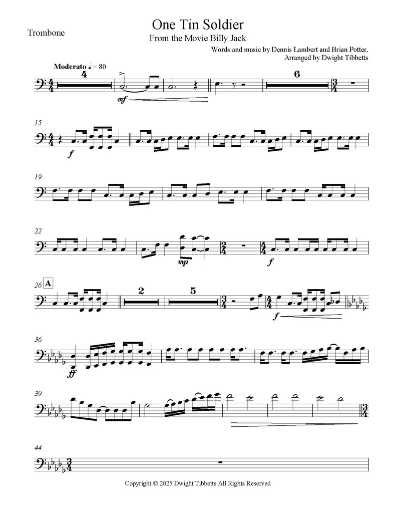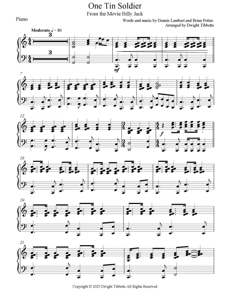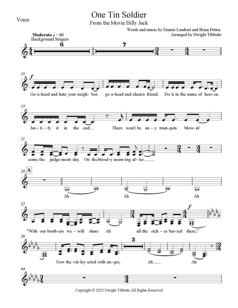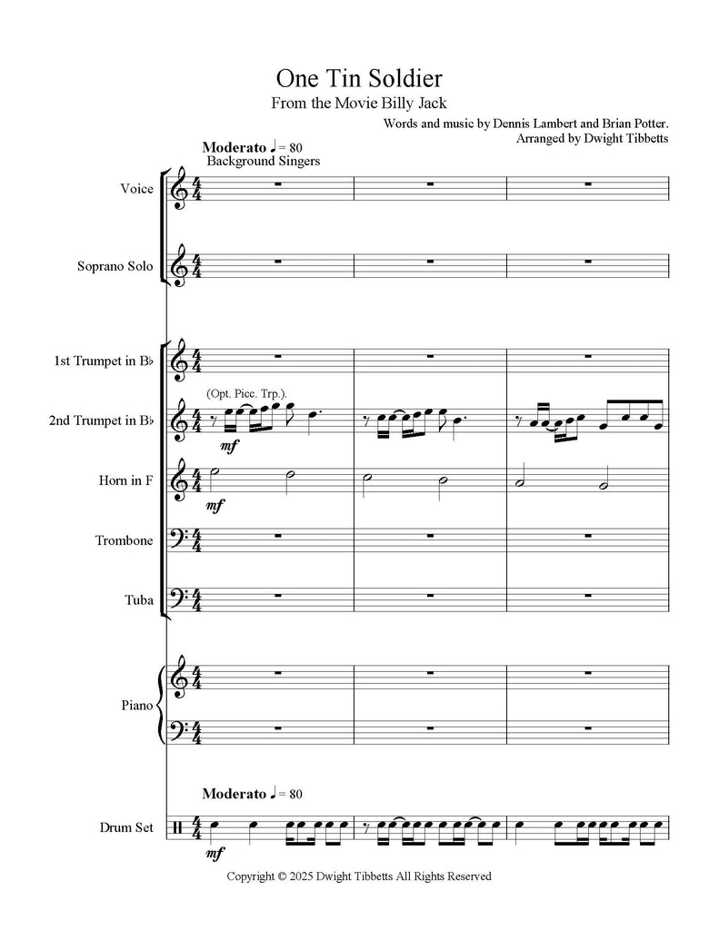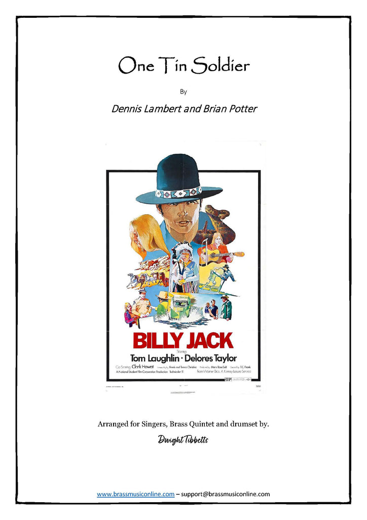One Tin Soldier, from the movie Billy Jack - Music and Text by Dennis Lambert and Brian Potter - arranged for Singers, Brass Quintet and drum set by Dwight Tibbett.